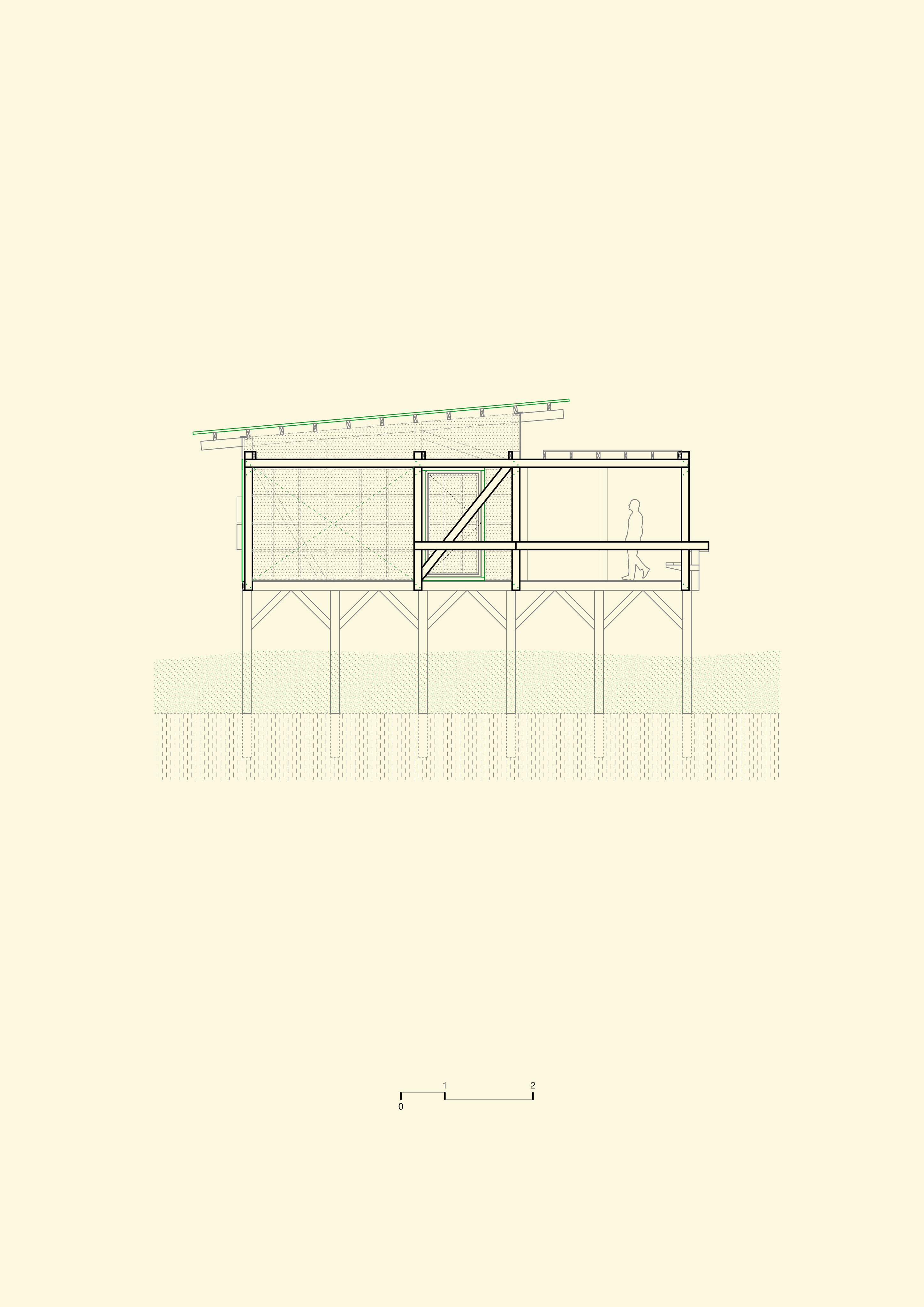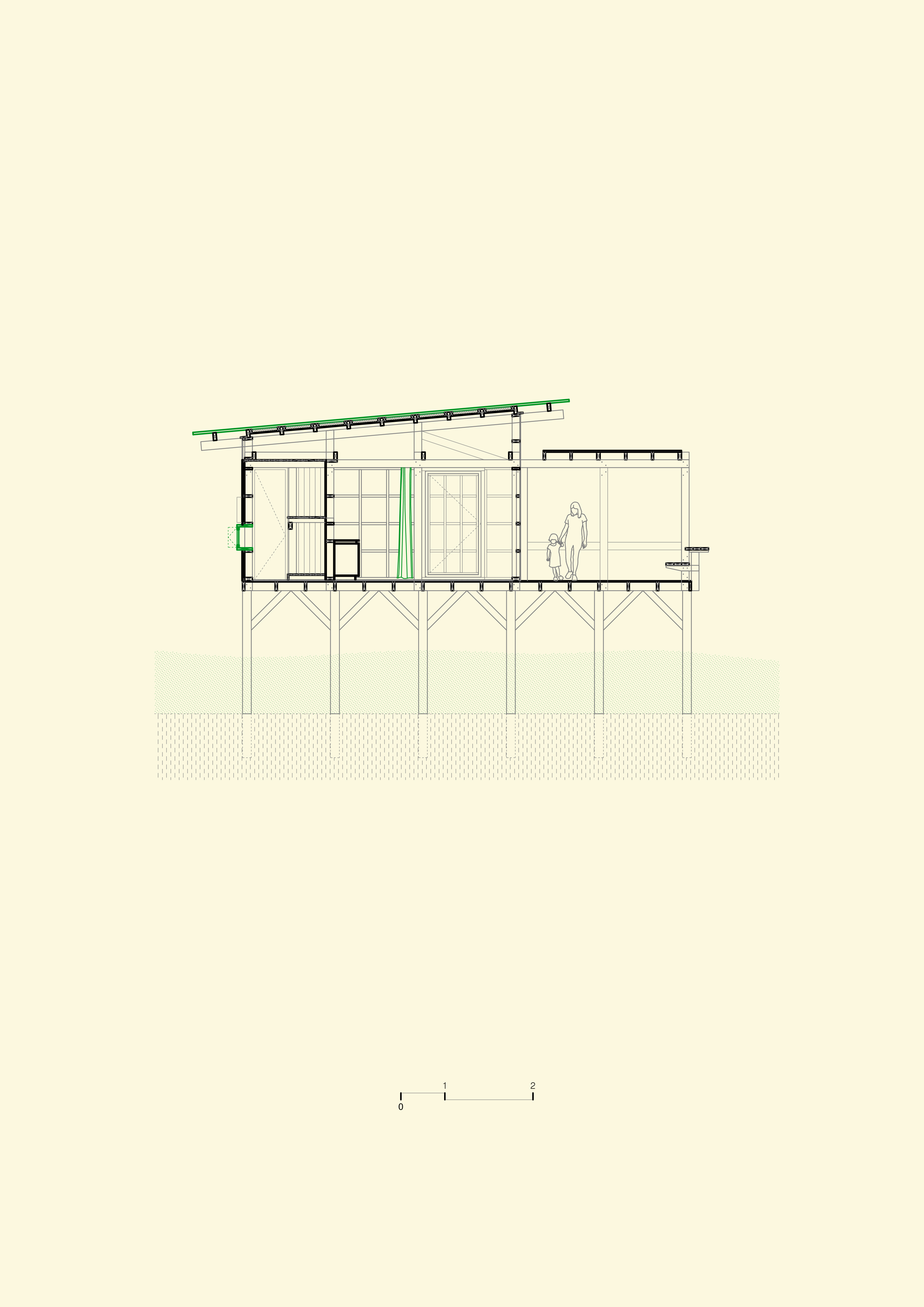 Extended over the platforms a grid of pillars that continues from the base and organized the total surface. Only a third was roofed and the rest stayed as an open –rainy- terrace, a space in between of multiple uses which allows willows to enter slightly. At the center was the closed space wish was considered as a large common space. Around it, the bedroom, bathroom and bunk beds. Most of the perimeter is glass windows and thanks to the heights, the willows shows thin branches that let a glimpse of the skies.